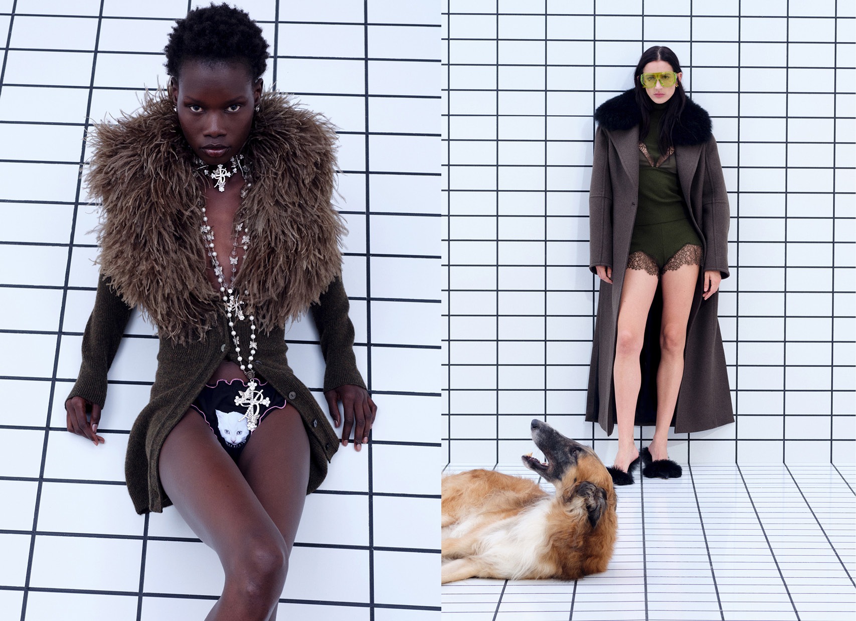 Le texture furry diventano anche un tributo agli animali domestici, con stampe leopardate e dettagli giocosi come le t-shirt con scritte “Woof” e “Miao”, e ironiche immagini di cuccioli su t-shirt e slip.