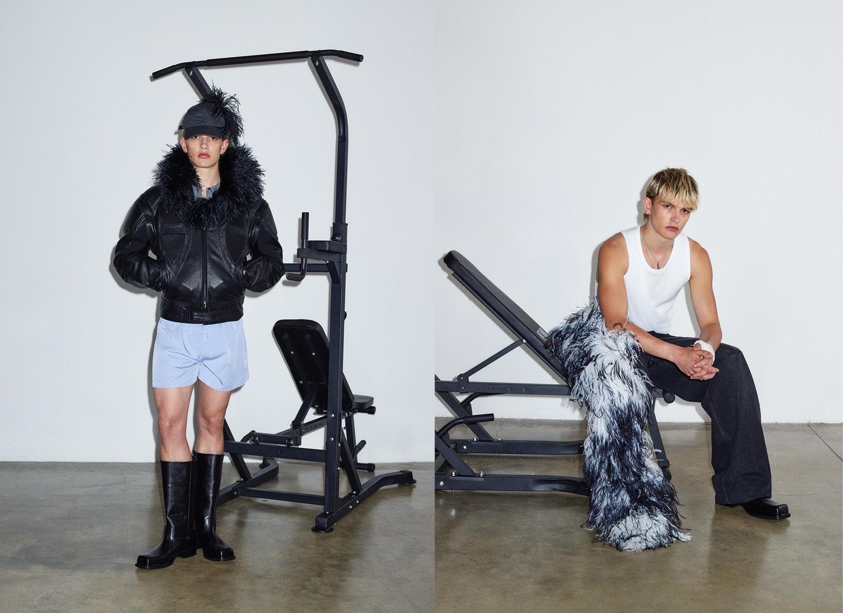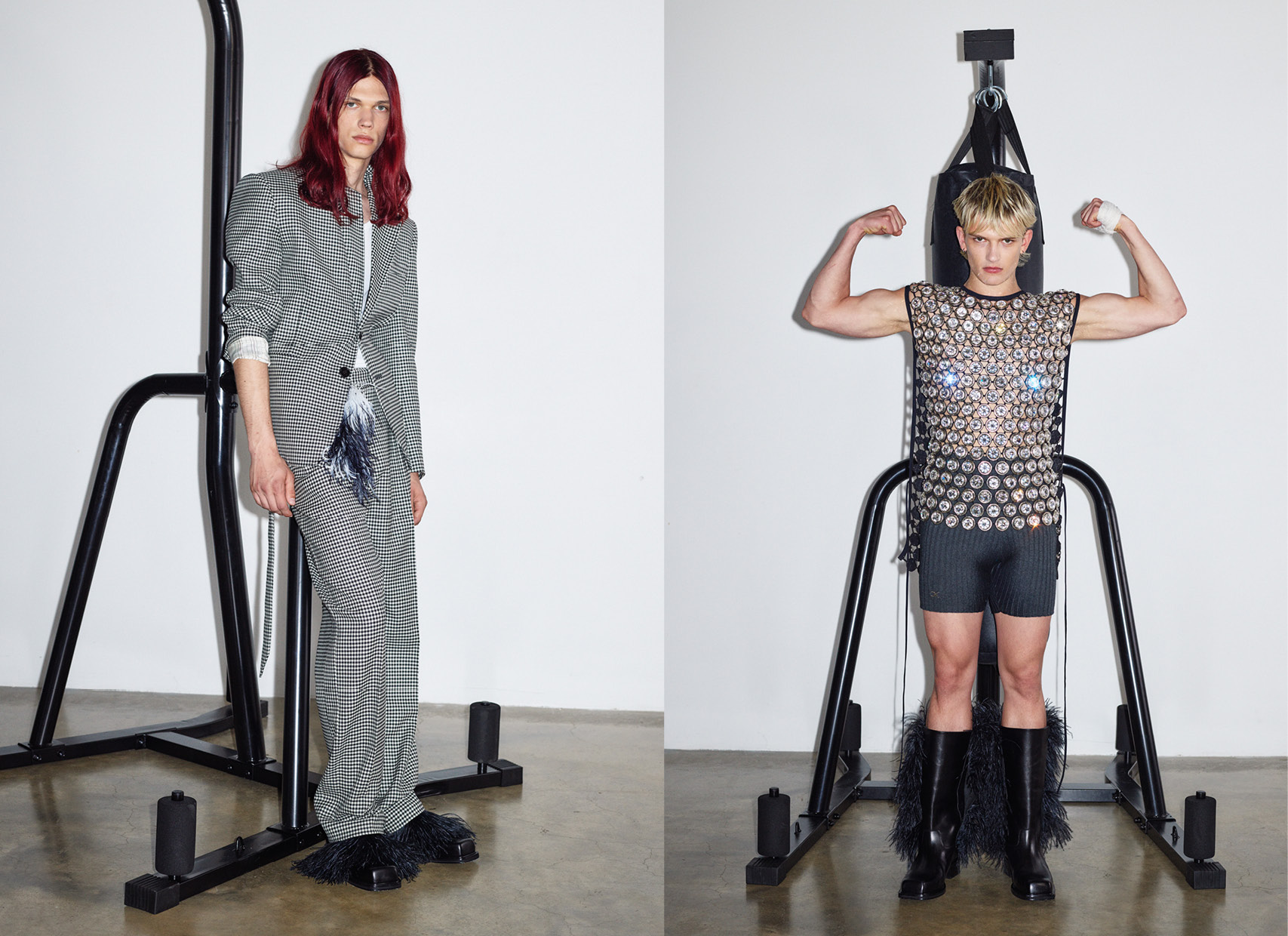Un’attenzione particolare è dedicata ai dettagli: elementi in cromo brandizzato, richiami alle giarrettiere e decorazioni ispirate all’arte di Gavin Turk, come nella sua opera Pop del 1993. Per equilibrare l’estetica maschile utilitaria, vengono introdotti tocchi di leggerezza attraverso piume opulente e tessuti soffici, evocando il movimento fluido della danza.