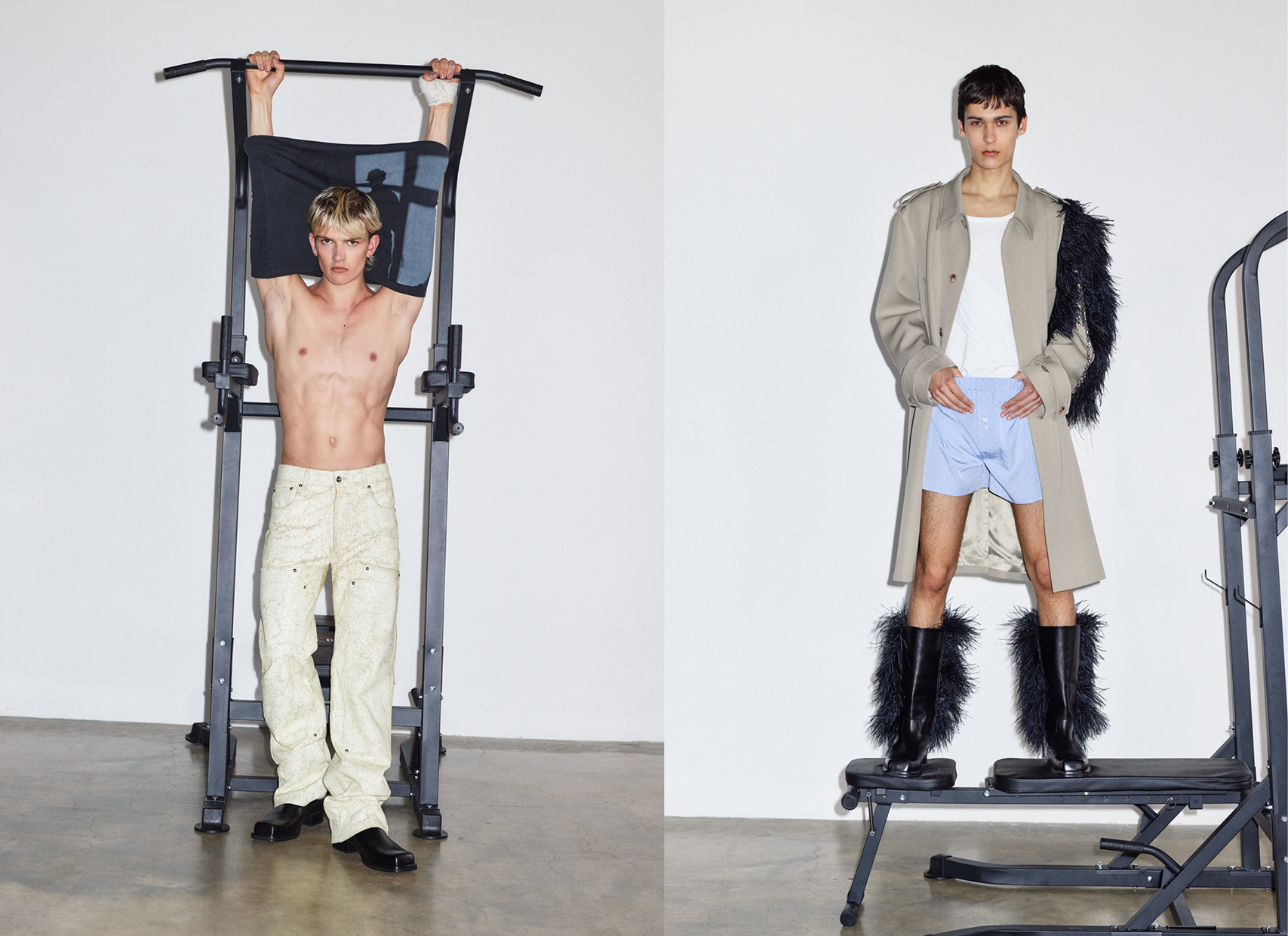 I tessuti tradizionali del guardaroba maschile vengono rielaborati e trasformati in capi unici. Le camicie in popeline, dal carattere sartoriale, si declinano in versioni militari o abbinate a boxer shorts. Il denim assume nuove identità, presentandosi in tonalità indaco polveroso o in una versione in bouclé grezzo. La pelle, sia in versione morbida nappe che in forme più vissute e distressate, aggiunge carattere alla collezione.