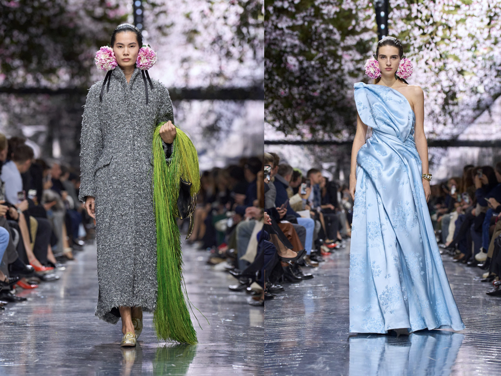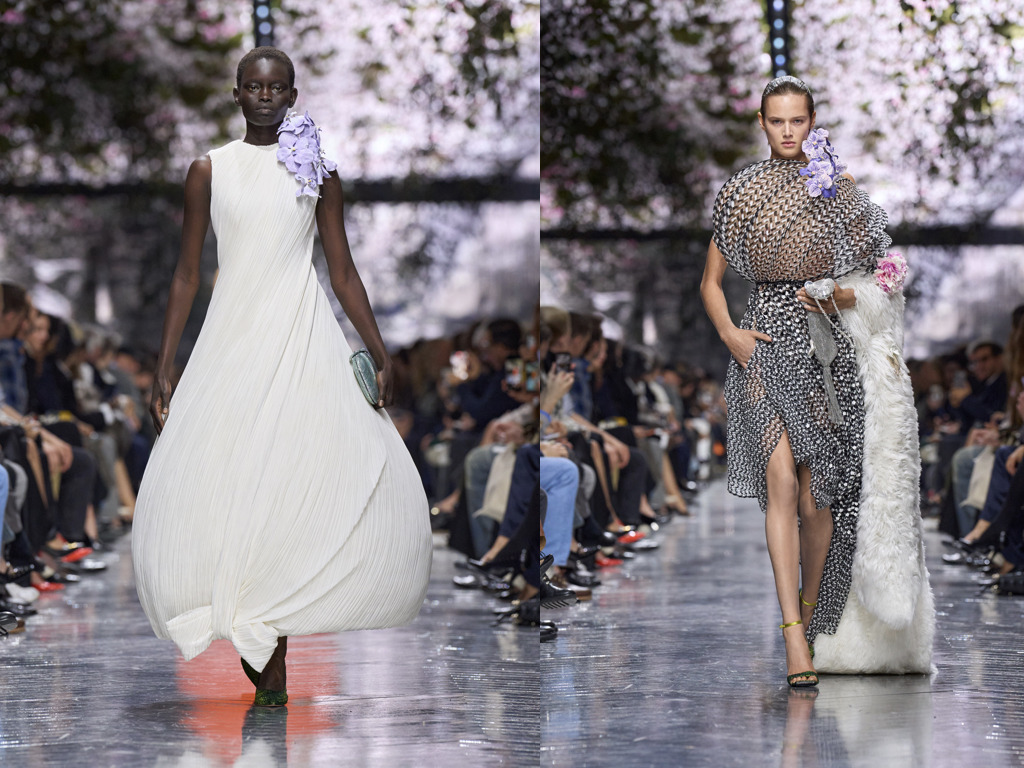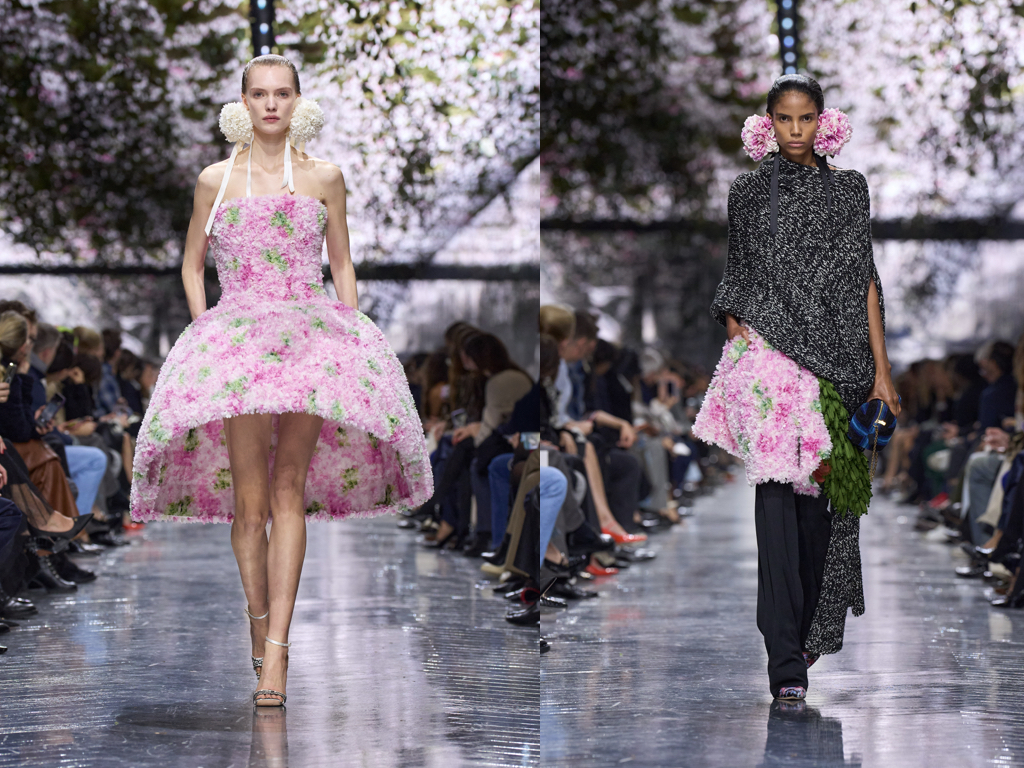 E così quei ciclamini rigogliosi investono i soffitti del Museo Rodin di Parigi in un’illusione ottica resa magica dagli specchi posizionati nella venue. La poesia della natura e della sua forza si fa materia da indossare e in passerella prendono vita abiti dall’essenza multiforme. Lo show si apre con una serie di look identici nelle silhouette scultoree ma differenziati dai colori complementari. Drappeggi leggeri e strutturati sorreggono forme sinuose che si ispirano ai vasi antropomorfi dell’artista Magdalene Odundo. Un nuovo lessico estetico si immette così nel vocabolario di Dior che, come la natura, si evolve nella dinamicità di questo nuovo capitolo.