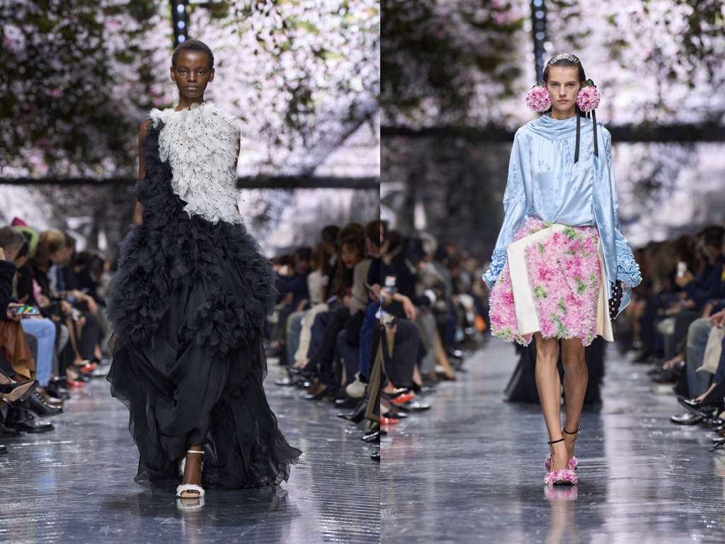 Applicazioni floreali adornano abiti in seta in un realismo botanico che si riflette anche nelle stratificazioni di chiffon e organza lavorate come piume. L’anatomia del corpo respira, si espande e conquista forme inaspettate come nei top balloon o nelle gonne e negli abiti dai volumi circolari. Le corolle dei fiori diventano i colli drammatici dei cappotti o si capovolgono nelle gonne sorrette da crinoline invisibili. Le lavorazioni e le applicazioni regalano ai look strutture complesse. Dai top emergono frange di “germogli” che cadono a cascata sui pantaloni ricoperti di petali a scaglie. Ogni pezzo diventa un racconto unico mentre la poesia del ciclamino ritorna ciclicamente. Negli orecchini in piena fioritura o negli abiti corti e dinamici che ci ricordano le forme di questo fiore. L’organza arricciata va a ricoprire le architettura degli abiti scultura in un rimando speciale all’unica collezione Haute Couture di Raf Simons per la Maison.