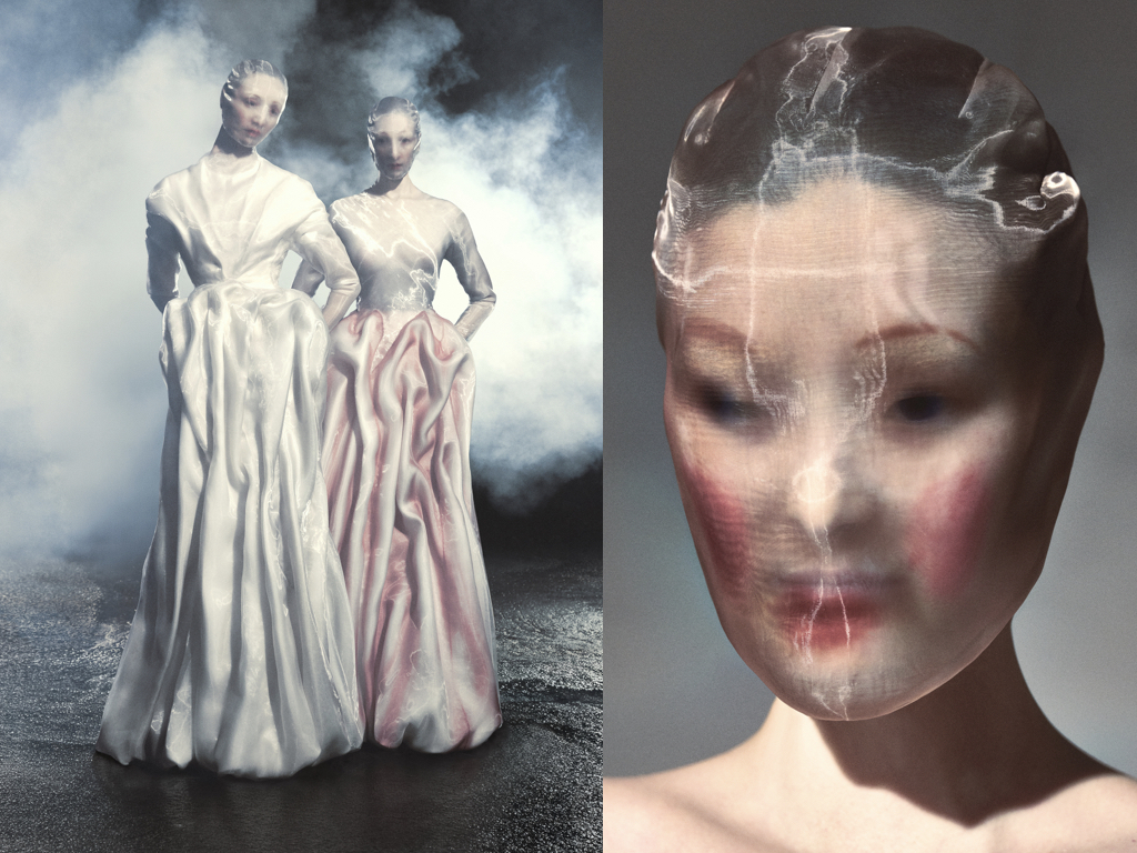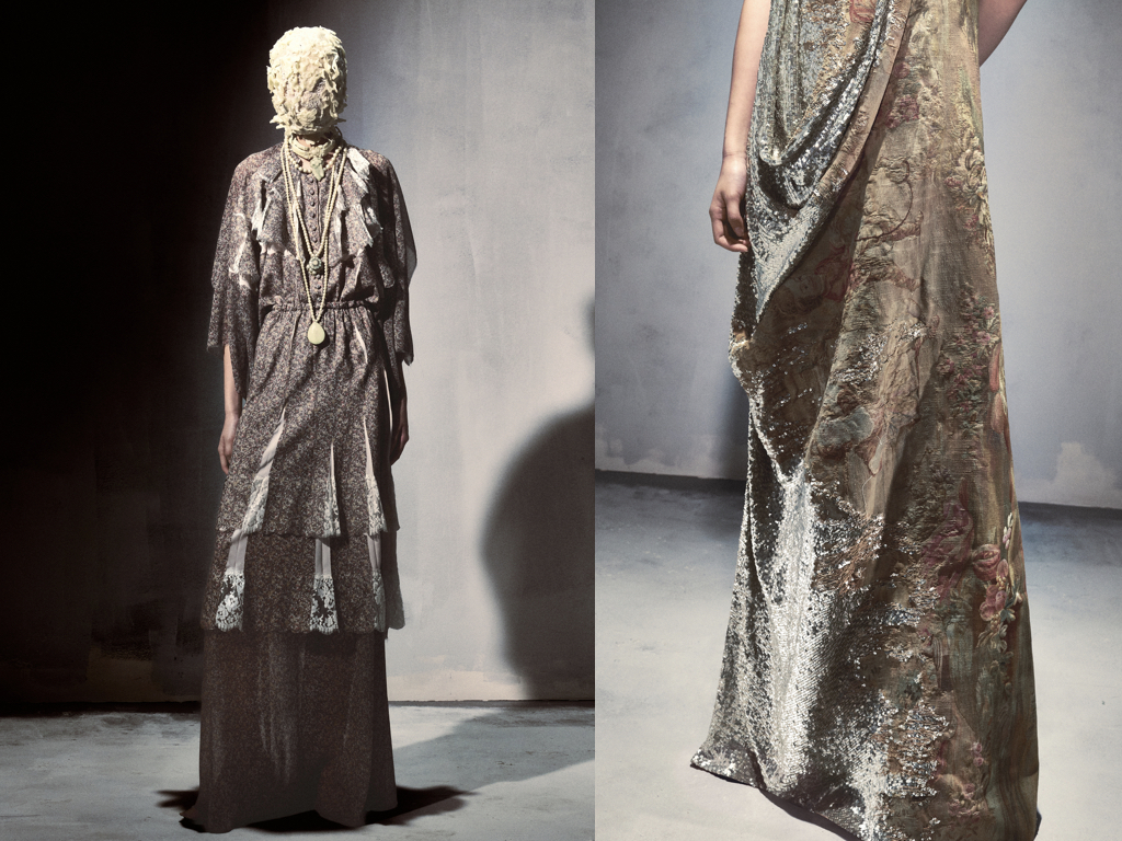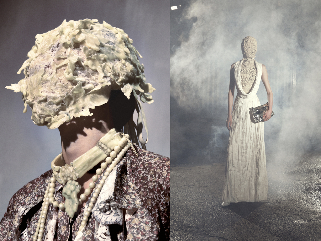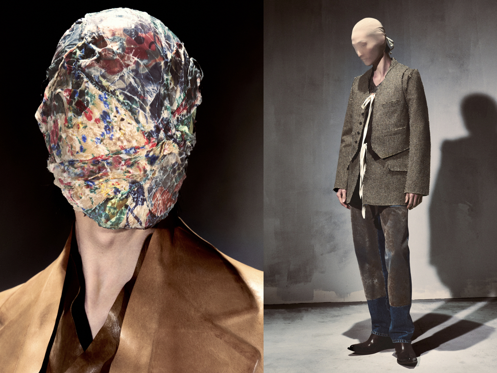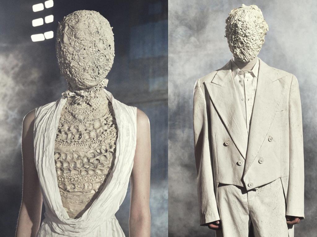 Il filo conduttore che unisce tutta la collezione è senza dubbio il concetto di anonimato che si mostra in modo lapalissiano attraverso le iconiche maschere. Un annullamento identitario che in moto circolare diventa l’identità ultima di Margiela il cui heritage è divenuto ormai fonte storica d’ispirazione creativa. L’archetipo della maschera si ricopre di applicazioni preziose, ricami di maglieria cristallizzate nella cera e schegge di porcellana, ma non solo. Vengono realizzate maschere in tessuto spalmato, in cotone vintage e merletti ma anche in Nylon proprio come le prime in assoluto presentate da Martin Margiela al suo debutto. Questi tessuti sperimentali che in molti casi sono il risultato di stratificazioni materiche si riflettono coordinatamente sugli abiti.
