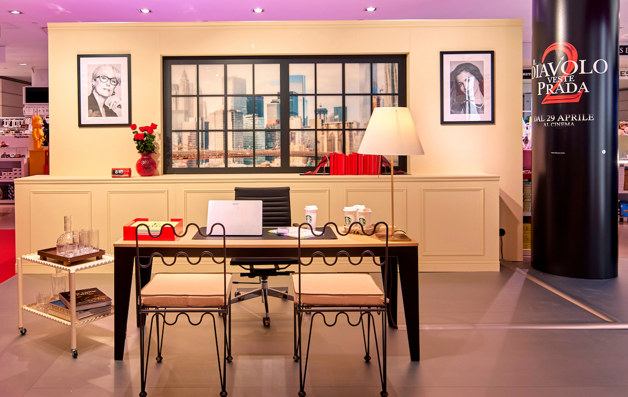 L’esterno della Rinascente non è l’unico spazio firmato da Il diavolo veste Prada 2. Oltrepassando le porte e recandosi al piano -1, si accede ad un’ambiente unico dove la redazione di Runway assume sembianze reali. Qui, la scrivania di Miranda Priestly prende posto sotto l’Air Snake, un’installazione realizzata per lo store da Aldo Cibic, in occasione della Milano Design Week 2022. La serpentina sorvola dall’alto gli abiti di Etro e Ferragamo, esposti assieme a calzature di Gianvito Rossi e Roger Vivier, e lascia rivivere l’esperienza incerta di Andy Sachs, che approccia con cautela alle dinamiche della rivista.