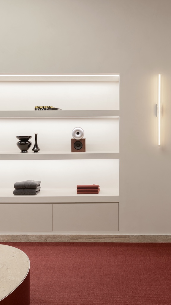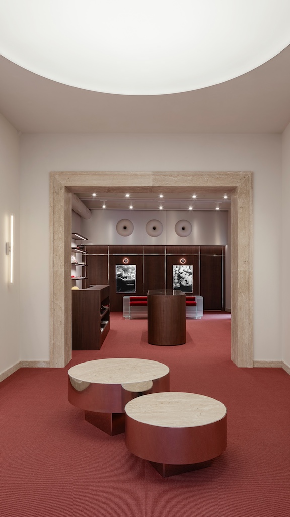 Un portale in travertino divide i due ambienti principali dello spazio che, così come accade nelle case, ci invita progressivamente ad entrare in stanze sempre più intime e raccolte. Si delinea un perfetto equilibrio fra live experience, condivisione, privacy ed esclusività. Nel punto focale del secondo ambiente figura un divano progettato da Luca Ricci che incarna tutte le caratteristiche estetiche del brand.