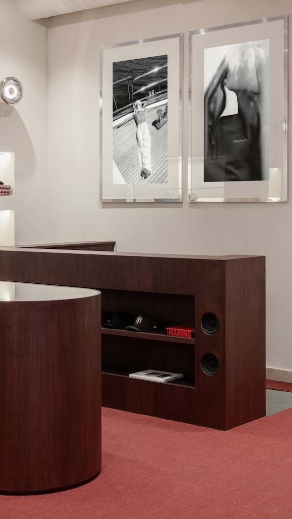 Ad accoglierci nello store illuminato da luci soffuse è un rosso barolo profondo e avvolgente che si sposa perfettamente con il classico beige identitario di FiveFourFive. Non una semplice scelta cromatica ma un vero e proprio manifesto estetico di una nuova identità costruita a seguito di un re-branding totalizzante.