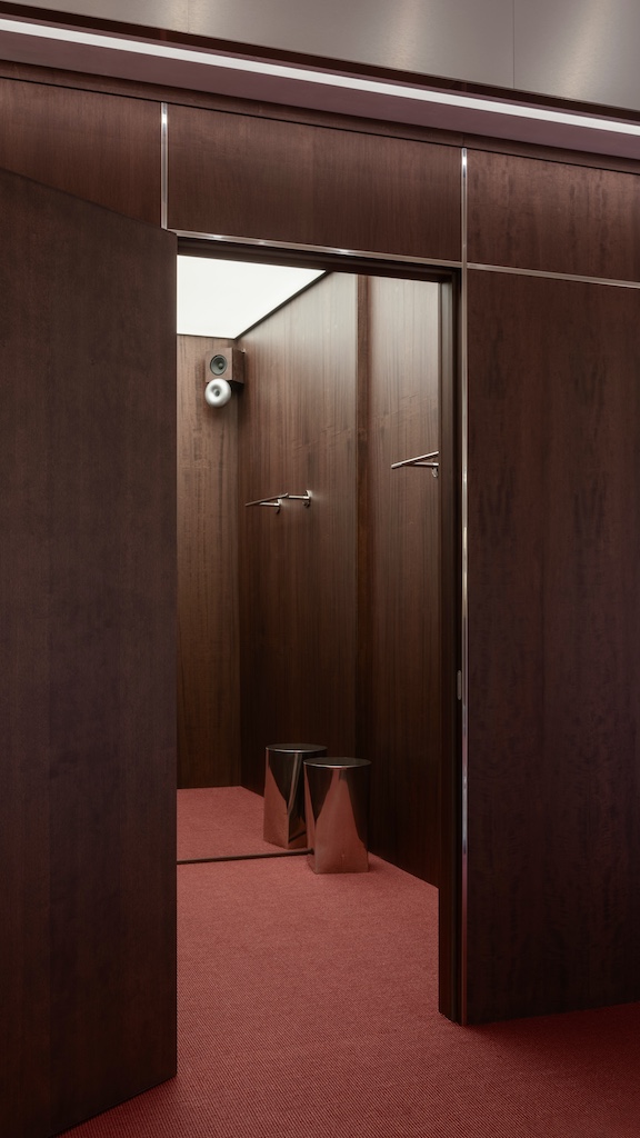 La struttura portate è realizzata in vetro e presenta delle morbide sedute con schienali rivestite del nuovo iconico rosso. Contrapposizione fra materia, texture e un linguaggio visivo limpido e immediatamente riconoscibile. Questa conversazione materica si protrae sul fondo della stanza che, ricoperta in legno, cela la parte più trafilata e raccolta del negozio: i camerini. L’atmosfera di questo “appartamento ideale” viene arricchita inoltre da un impianto hi-fi progettato da Horny Hi-Fi. L’esperienza visiva raggiunge così una dimensione sensoriale totalizzante. L’ambiente e gli elementi che lo compongono ci aiutano a conoscere più a fondo l’universo di FiveFourFive.